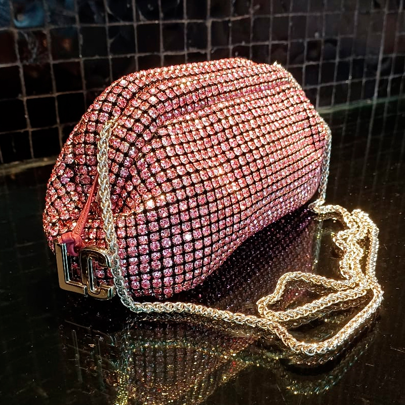 Bolsa Mini Clothers de Pedras de Cristais Rosa na ferragem em Prata.