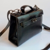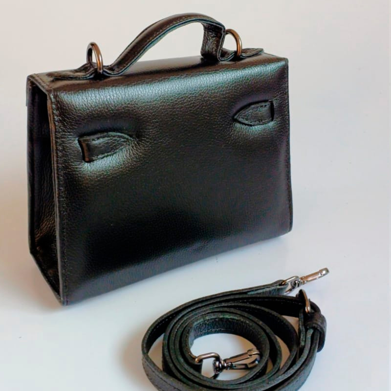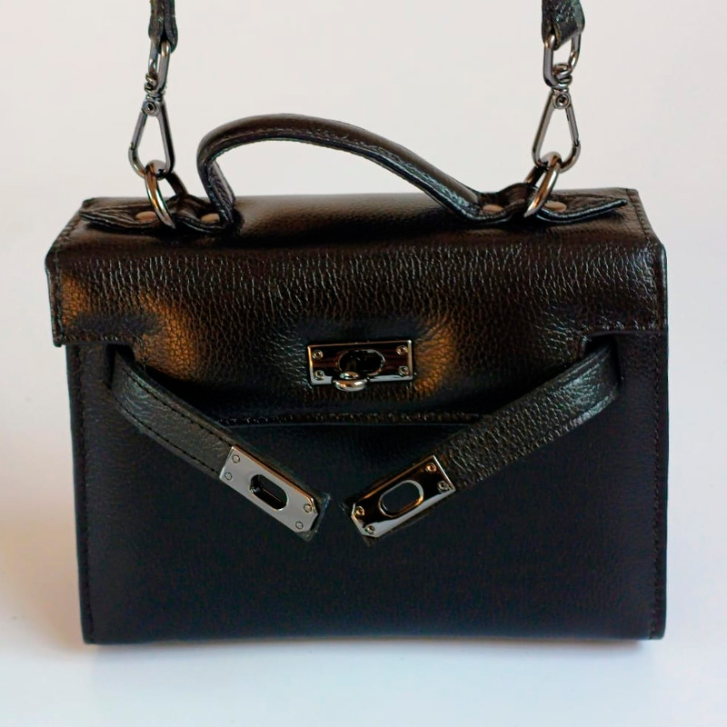 Bolsa de Couro Mini Black Luxo. Ferragem em Onix e alça longa transversal. Cabe celular.