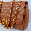 Bolsa de Couro Matelassê Clássica Caramelo com correntes dourada e fechamento Oval com dupla tampa.